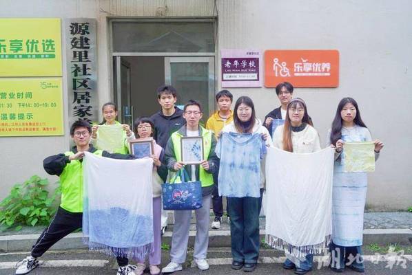 活动现场,非遗蓝染体验为托管班拉开趣味序幕。学生党员与志愿者化身“非遗导师”,先向孩子们讲述蓝染的历史渊源,再拆解“扎、染、晾”核心工序。从折叠白布、捆扎花纹到浸入天然靛蓝染料,志愿者手把手指导,当白布在浸染氧化中浮现出独一无二的纹样时,孩子们满脸惊喜,沉浸式感受古老技艺的匠心魅力。