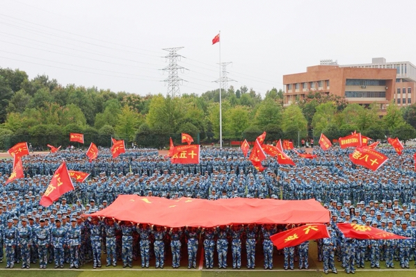 随后的军训成果汇报环节将现场气氛推向高潮。军体拳方阵动作精准,气势如虹;49个受阅方阵身着戎装,迈着铿锵有力的步伐依次通过主席台,口号声响彻云霄。集体合唱《歌唱祖国》深情献礼国庆,展现了新一代学子的昂扬斗志。