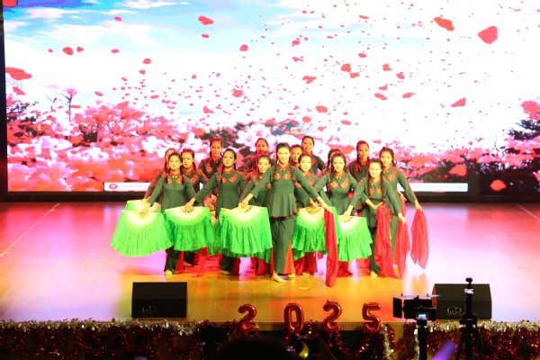 晚会节目形式多样,精彩纷呈。既有开场舞《奔跑的青春》瞬间点燃全场的活力,也有群舞《映山红》用优美舞姿演绎的红色深情;既有相声《返校》以妙语连珠带来的满堂欢笑,也有情景朗诵《怒放的青春》用慷慨激昂抒发的青年壮志。乐队一曲《海阔天空》唱响追梦的摇滚力量,走秀《溯光》则步态生辉,尽显礼仪风范。从深情款款的《落叶归根》《友情岁月》,到活力四射的舞蹈串烧,再到最终引爆全场的歌伴舞《我和我的祖国》,整场晚会高潮迭起,掌声不断。