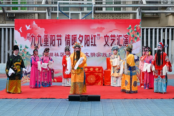 文艺汇演环节中,志愿者不仅担任主持人,还积极参与节目表演。一名学生朗诵诗词《采桑子·重阳》,饱含深情的诵读赢得阵阵掌声。社区的银发居民们也纷纷登台献艺,歌舞、戏曲、独唱轮番上演,现场掌声不断、笑声连连。志愿者们全程陪伴、递水、协助拍照,为每位老人送上亲手书写的祝福贺卡,字里行间传递着真挚的祝愿与敬意老人们笑容满面,连连道谢,现场充满了温情与感动。活动结束后,志愿者们主动承担舞台拆除、物资整理与场地清扫任务,以高效、细致的服务为活动画上圆满句号。