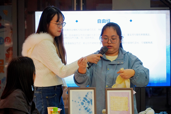 最后,青年们以自制植物染布条为原料,开展非遗编织。大家巧用编、织、绕等手法,将色彩灵动的染布转化为精美布艺画雏形,再以“自由缝”固定成型,实现从“染”到“创”的过程,让传统技艺在创新实践中焕发新生。