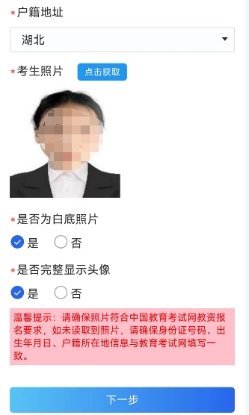 5.选择出生日期和户籍,然后“点击获取”检查考生照片。(请务必确保出生日期和户籍选择和中国教育考试网填写一致,请仔细核对保存一致。)
