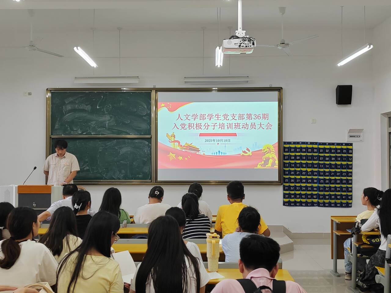 2025年10月10日12时,人文学院学生党支部第36期入党积极分子培训班动员大会于J3—112教室举行。学院党总支书记周景斌、学生党支部书记高悦、全体辅导员及第36期60位入党积极分子与会,大会由辅导员徐双勇主持。
