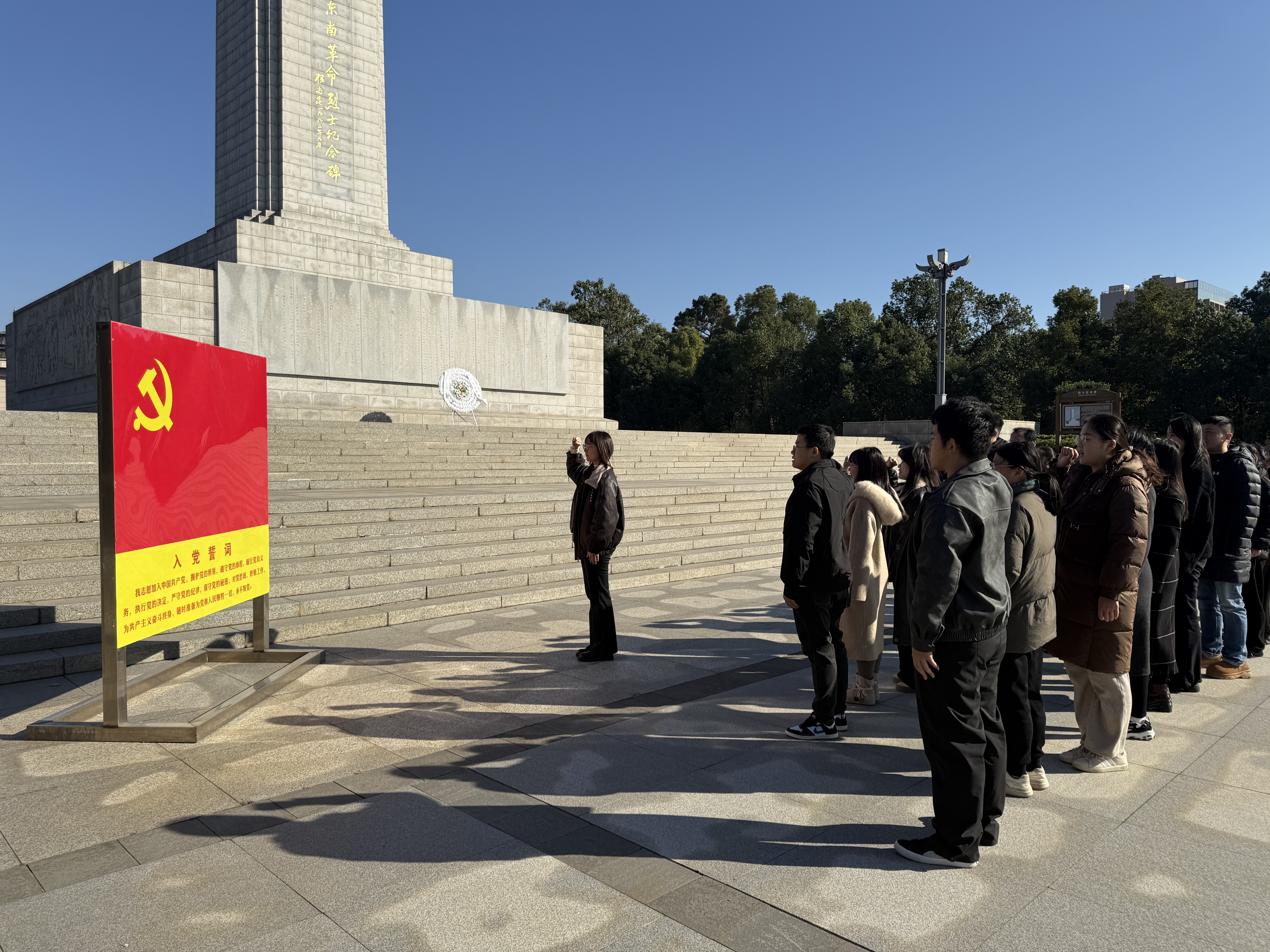 上午8:30,全体党员从安博官网登录入口图书馆门前统一乘车出发,于9:30抵达湘鄂赣边区鄂东南革命烈士陵园。在巍然屹立的革命烈士纪念碑前,党员同志们整齐列队,于纪念碑前肃立默哀,表达对革命先烈的深切缅怀与崇高敬意。随后,党员代表向烈士纪念碑敬献花篮,学院领导上前整理挽联,寄托哀思。面对鲜红的党旗,全体党员重温入党誓词,铿锵誓言响彻陵园,坚定初心使命。