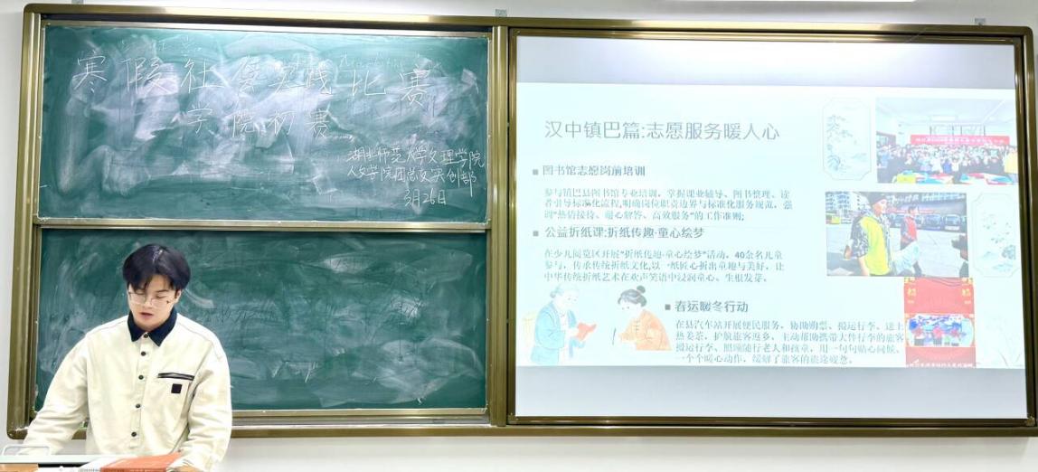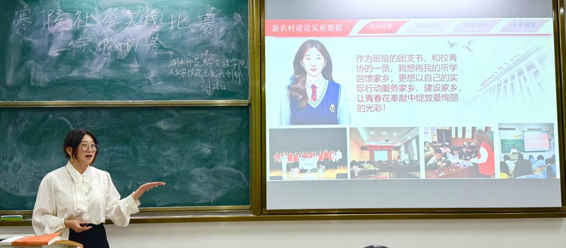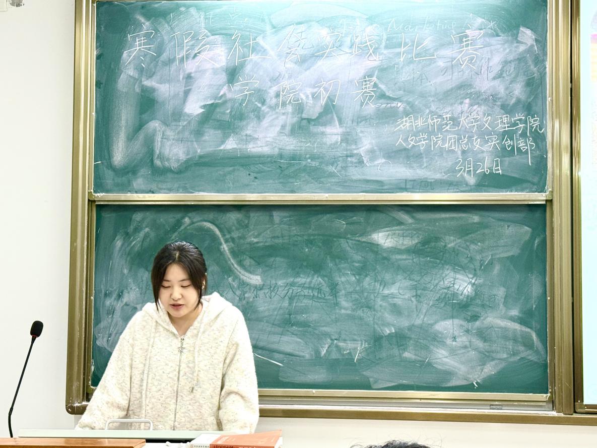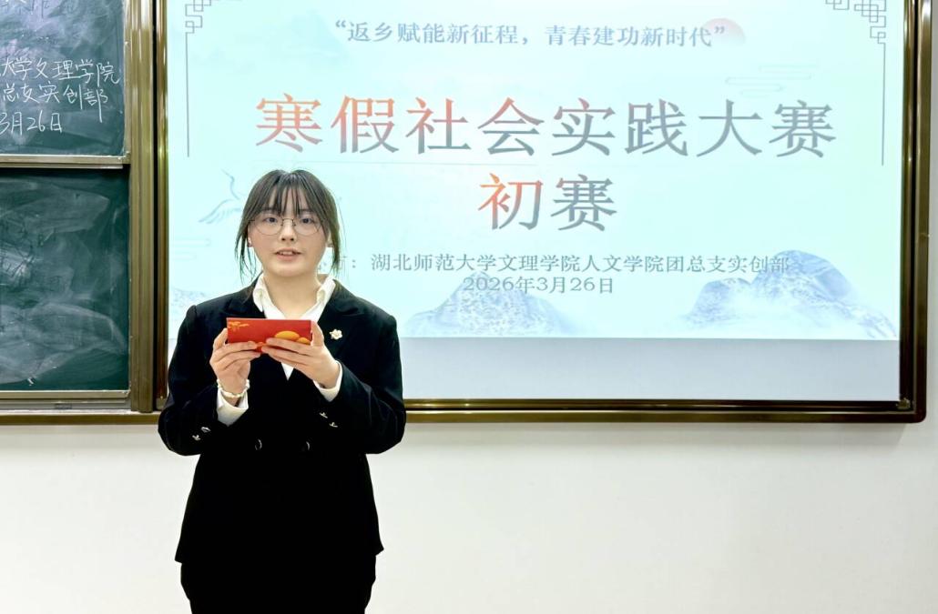 为深入学习贯彻习近平新时代中国特色社会主义思想,推动思政教育与社会实践深度融合,人文学院团总支实创部于2026326日晚,在J3-103教室举办“返乡赋能新征程 青春建功新时代”寒假社会实践比赛学院初赛,集中展示了学子“返家乡”实践成果,引导青年扎根基层、服务家乡。