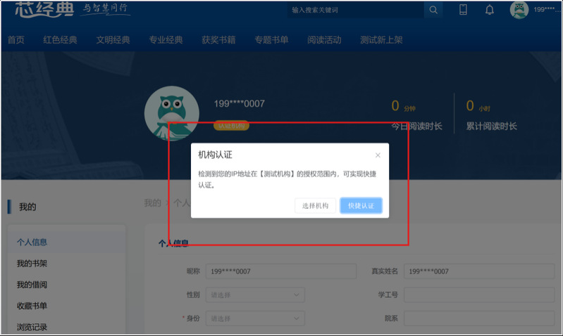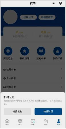 第三步:账号注册后,选择认证机构,弹出机构认证页面,点击【快捷认证】或选择/检索【安博官网登录入口】实现认证后开启阅读学习之旅。