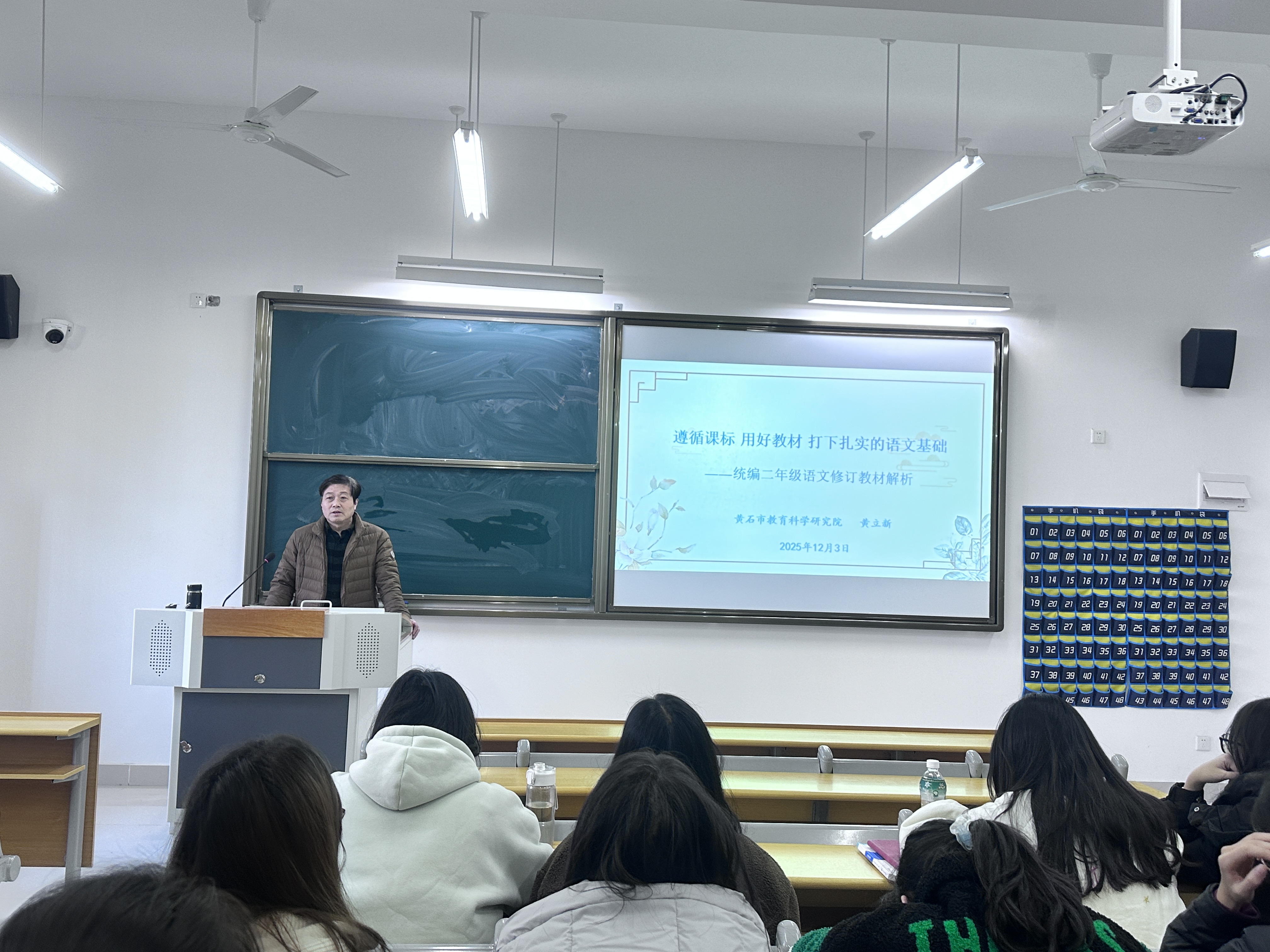 12月3日,市教育科学研究院黄立新老师在J3-105教室开展《统编二年级语文修订教材解析》专题讲座。小学教育2401班、2402班分时段参与,讲座以“教材修订要点、教材内容解析、教学应注意的问题、常见问题提示”四大模块为框架,紧密围绕二年级语文新教材的核心变化与教学实践需求,内容详实、指导性强,为师生精准把握教材逻辑与教学方向提供了有力支撑。
