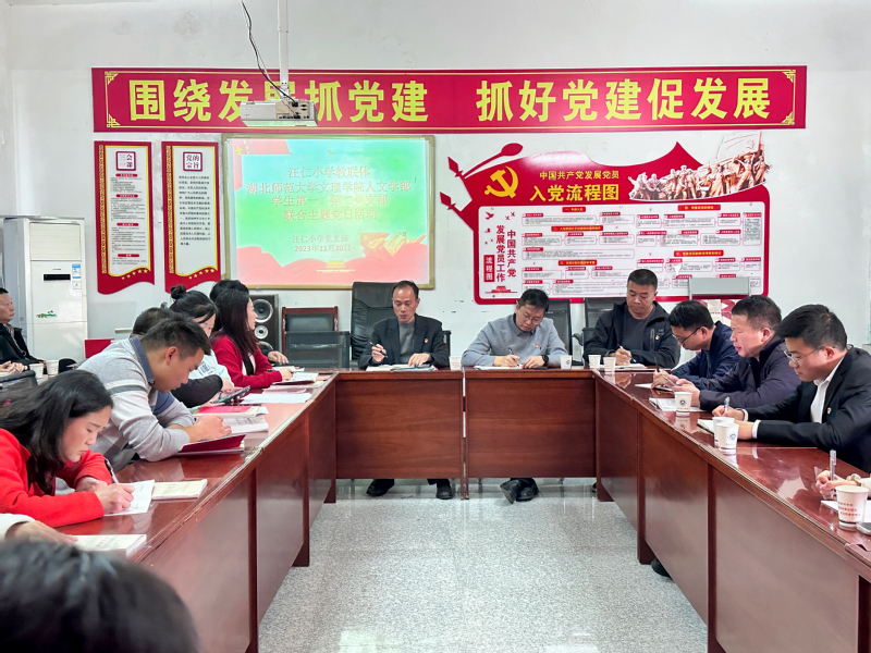 2023年11月20日12时,在学校党委、学部党总支的部署和指导下,学生第二党支部书记郭旭林、辅导员杨峰、程胜伟老师的带领下,人文学部学生党支部一行21人与汪仁小学教联体教工党支部共同开展以“巩固主题教育成果,立足岗位作贡献”为主题的专题研讨活动。 汪仁镇中心学校领导、汪仁小学教联体校领导、党员教师出席本次活动。