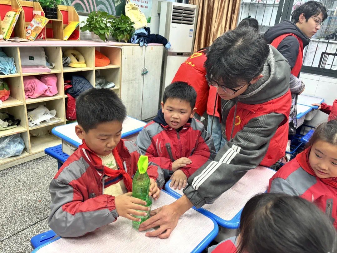 理工学部志愿者们分成三个小队,前往三个不同的班级带领小朋友们感受科学的魅力,带着小朋友一起做实验。实验过程中,小朋友们积极参与,热情高涨,踊跃回答问题,志愿者们帮助小朋友操作比较困难的实验步骤。