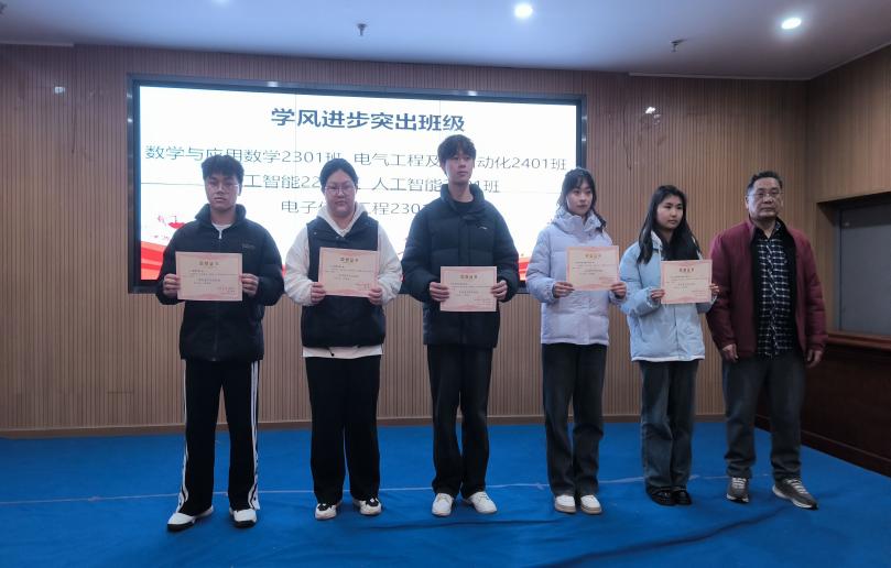 随后,学风建设系列活动表彰环节正式开始。现场气氛热烈,奖项依次揭晓。朱明亮老师率先上台,为“三字初赛得奖者”颁奖,肯定他们在书写技能上的深厚功底。接李晶老师颁发“帮扶先锋标兵”荣誉,赞扬同学们乐于助人的精神。董学良老师为“程序设计大赛一等奖”获得者颁奖,见证他们在代码世界的卓越表现。方婷老师则将荣誉给予“算法设计赛获奖者”,表彰其逻辑思维与创新能力。蒋万林老师、周磊老师先后为“学生手册知识竞赛优秀个人奖”得主颁奖,激励同学们对校园规范的深入理解。郭烨老师为“文明寝室”代表颁奖,赞许他们营造的良好生活环境。肖书记上台,为“学风先进班级”授予荣誉,彰显这些班级浓厚的学习氛围。潘主任为“学风进步突出班级”颁奖,鼓励大家持续奋进。最后,程主任为荣获“优秀组织奖”的班级颁奖,感谢他们为活动顺利开展的辛勤付出。