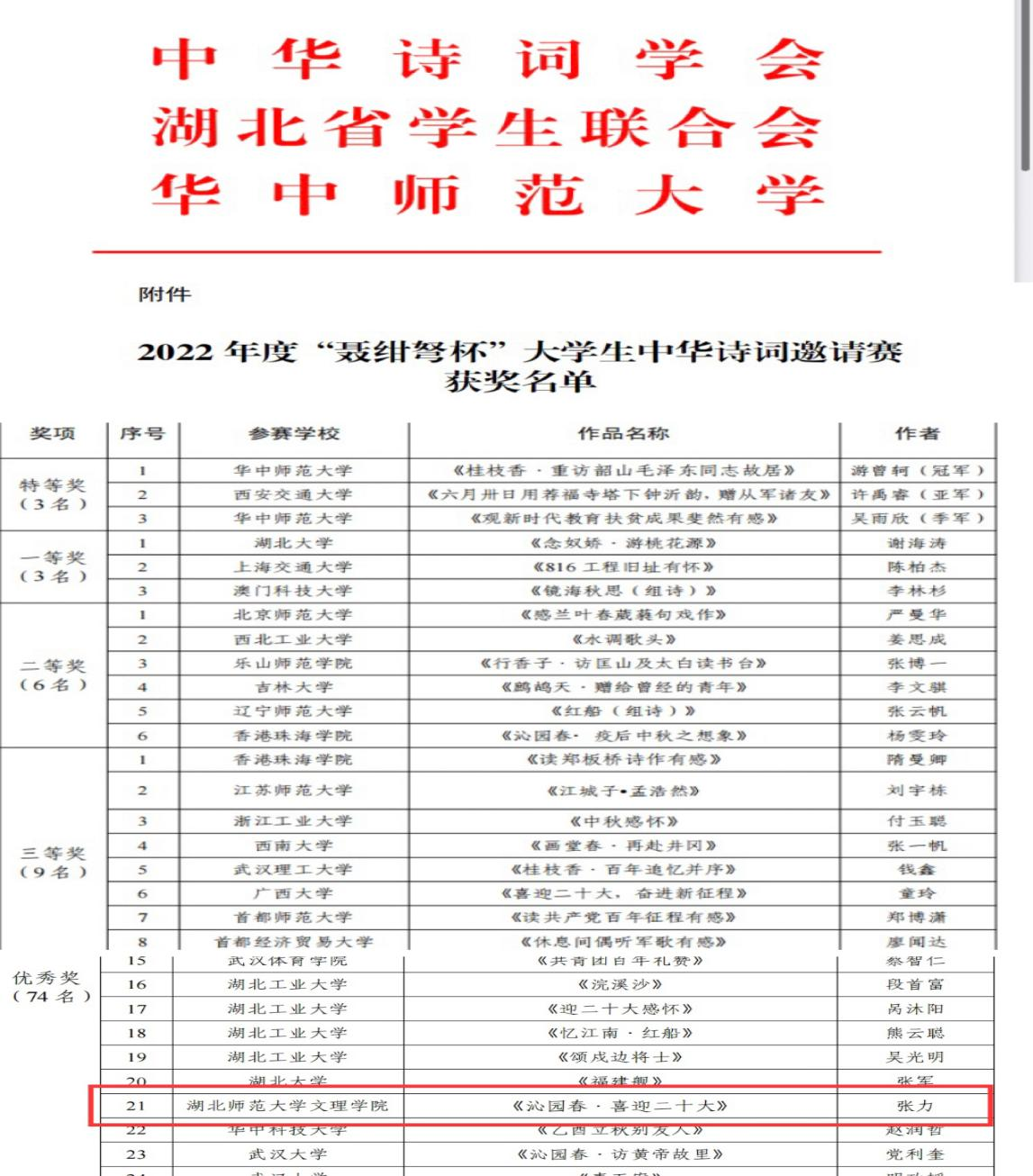 (通讯员:苏祎)6月6日,由中华诗词学会、中华诗词研究院、湖北省学生联合会、华中师范大学联合举办的2022年度“聂绀弩杯”大学生中华诗词邀请赛赛结果已公布。安博anbo(中国)张力同学荣获佳绩。