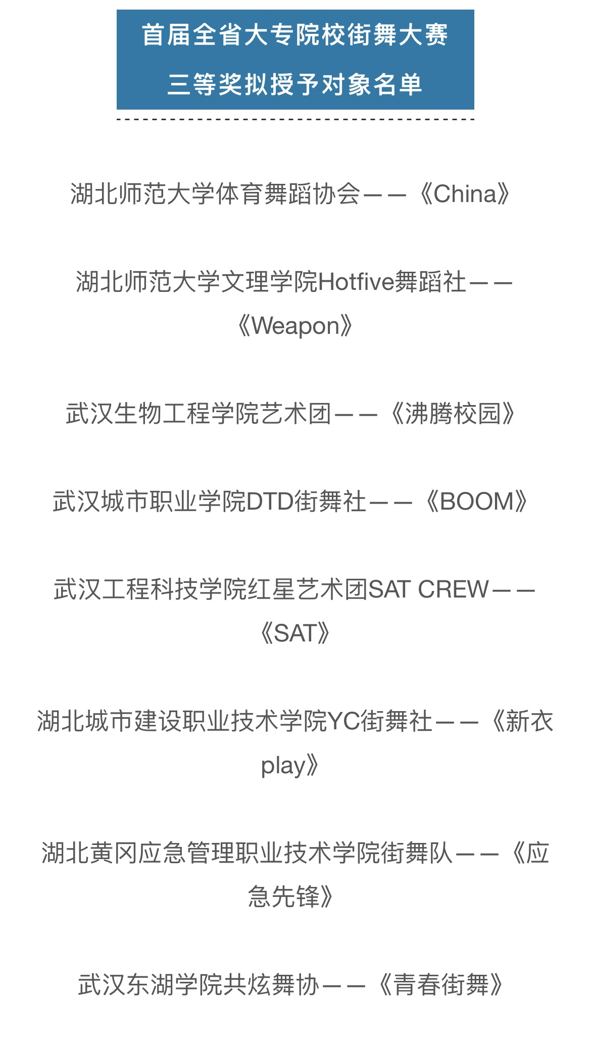 (通讯员:苏祎)引领新风尚,欢悦新时代。9月10日,首届全省大专院校街舞展演在黄冈市遗爱湖公园举办。安博anbo(中国)代表队“Hot Five舞蹈社”的舞蹈作品《weapon》在此次比赛中荣获三等奖。
