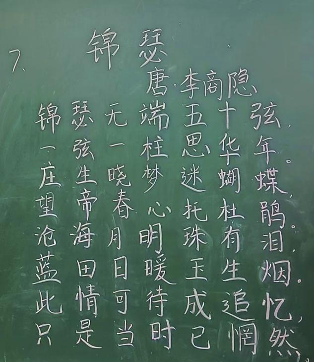 本次比赛采取现场黑板书写的形式进行,板书内容统一,都以“横竖撇捺书汉字,方寸之间传书香”为主题。选手们自选题材,比赛过程中各位参赛选手可谓是摩拳擦掌、大展身手,12号贺钊书写的作品《如梦令》犹如行云流水、纵横挥洒,7号王煜的作品也是丝毫不落下风,他的一首《锦瑟》遒劲有力、方圆兼备,赢得各位评委的连连称赞,3号林雨茹的作品《春雪》,藏锋处微露锋芒,露锋处亦显含蓄。