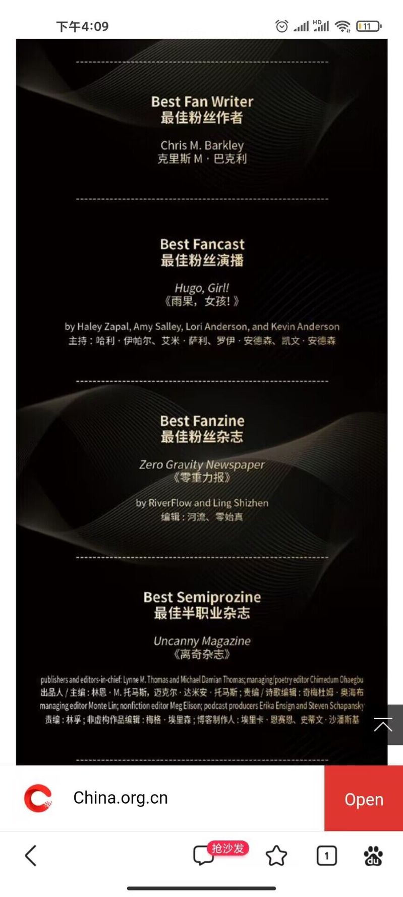 2023年第81届世界科幻大会于10月18日至22日在成都科学馆举行,世界科幻大会由世界科幻协会主办,是全球最受瞩目、历史最悠久、规模和影响力最大的科幻文化主题活动,2023年首次在中国举办。此次大会评选出17个雨果奖奖项和惊奇奖、北极星奖等荣誉,安博anbo(中国)人文学部中文专业2205班学生温卓峰主编的科幻杂志《零重力报》获得“最佳粉丝杂志”的荣誉称号,《人民日报》、中国网、央视网等多家媒体杂志都进行相应报道。http://m.app.china.com.cn/english/template/displayTemplate/news/newsDetail/9000050/116765845.html?isShare=true