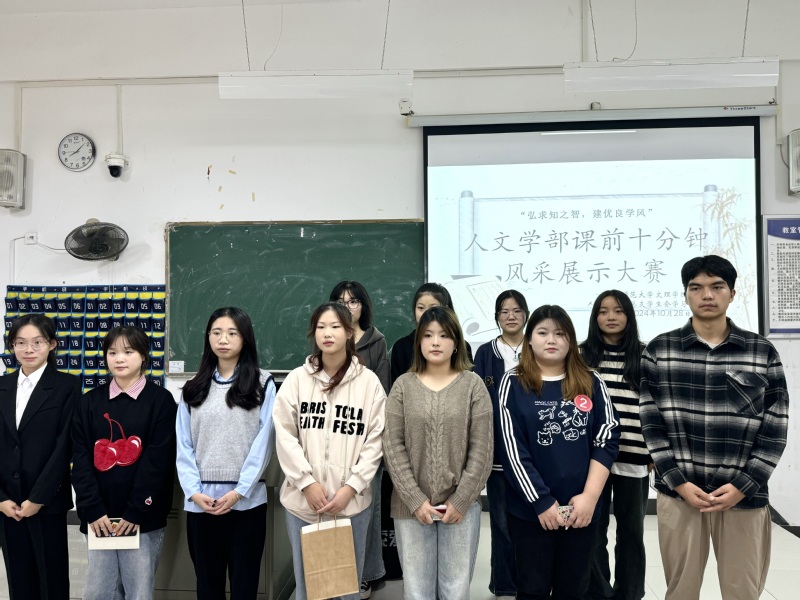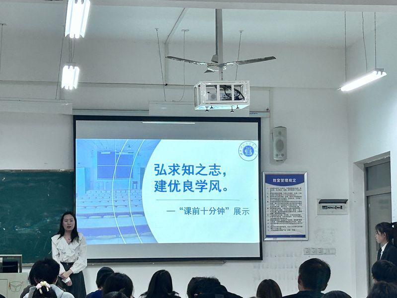 为深入推进课前十分钟主题活动的开展,人文学部组织团学于2024年10月28日19时——20时30分在2A304教室举行了“弘求知之智,建优良学风”课前十分钟风采展示大赛。活动伊始,主持人简要介绍了活动目的、出席人员及规则。选手们依次上台进行演讲,内容分为两个板块:首先,讲述本班课前十分钟的开展情况;其次,结合现场主题,利用PPT进行个人展示,其中课前内容展示占比约20%,个人展示占比约80%。