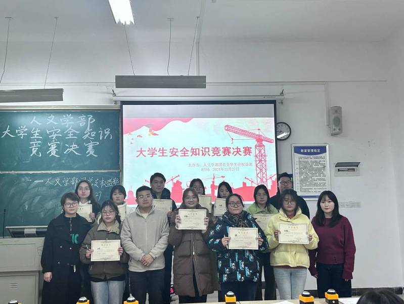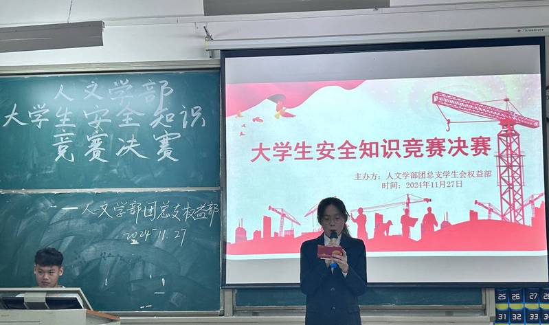 为了提升大学生的安全防范意识,检验学生对安全知识的实际应用能力,促进校园安全文化建设,人文学部团总支权益部于2024年11月27日晚在1B101举行了“谨记安全知识,构建安全校园”主题安全知识竞赛。