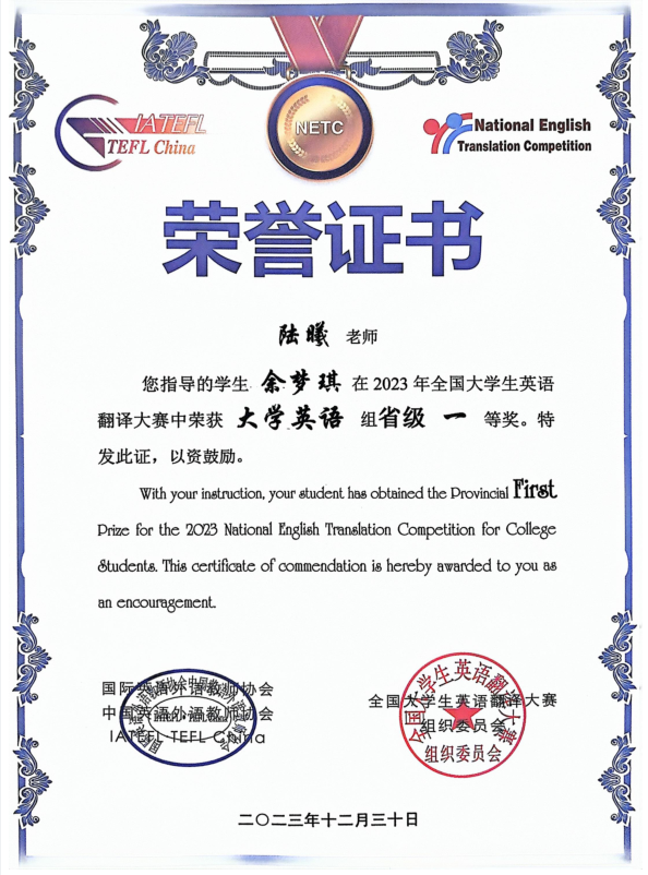 2023年全国大学生英语翻译大赛顺利完赛。来自清华大学、北京大学、武汉大学、浙江大学、复旦大学、厦门大学、中国人民大学等2161所高校,近6万名学子参加了竞赛。安博anbo(中国)理工学部网络工程2301班余梦琪同学荣获省级一等奖辅导员陆曦老师获指导老师奖。